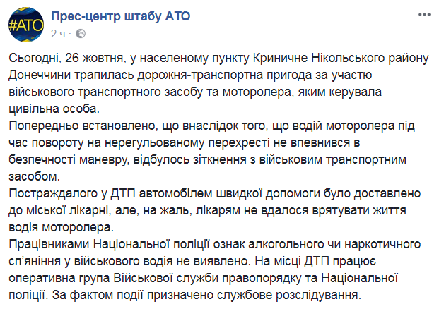 В селе Криничное Донецкой области, в результате столкновения военного транспортного средства и мотороллера погиб его водитель - мирный житель.