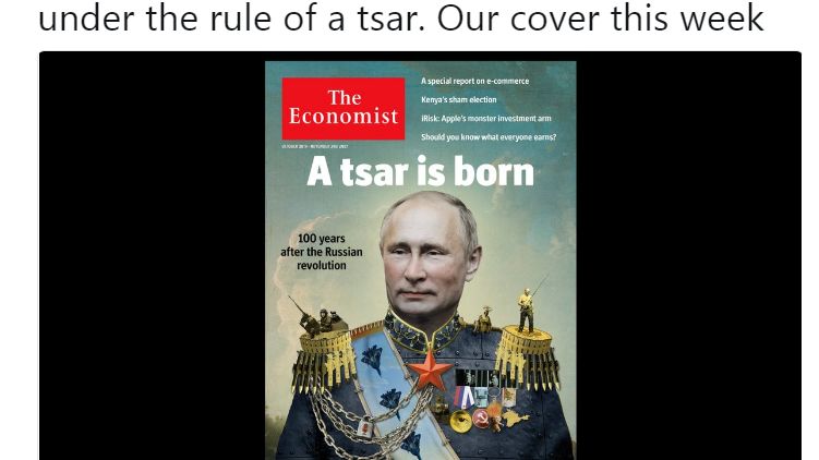 "В то время как мир отмечает столетие Октябрьской революции, Россия вновь находится под властью царя. Вот наша обложка на эту неделю", - говорится в сообщении, опубликованном в twitter'e британского издания.