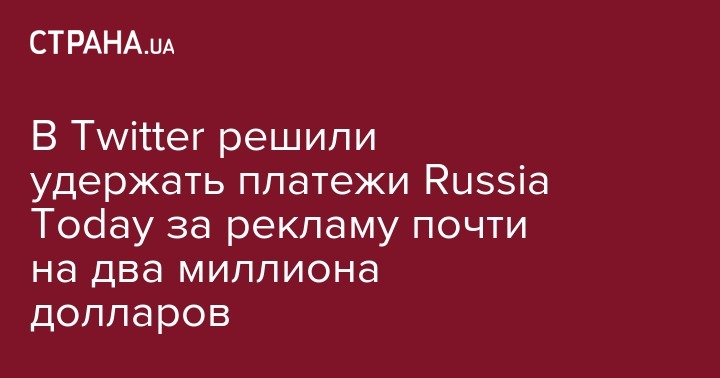 Компания Twitter приняла решение удержать уже внесенные и будущие платежи телеканала Russia Today (RT) за рекламу в объеме $1,9 млн и направить их на исследования.