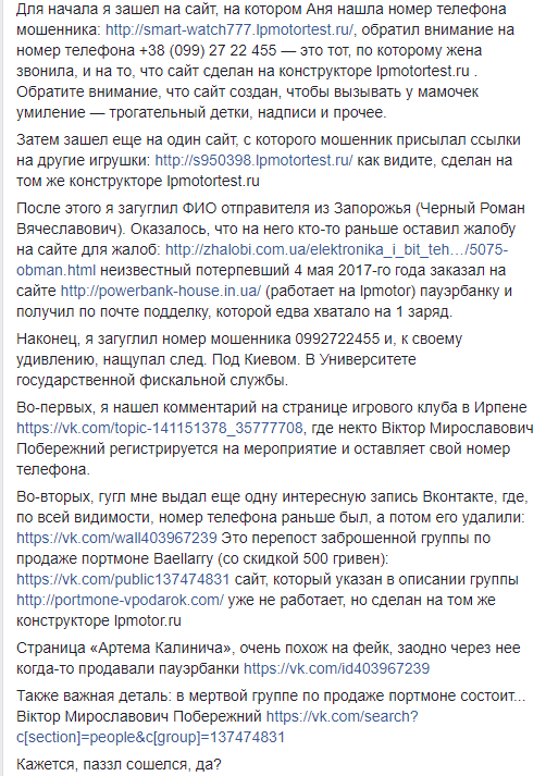 В Киеве пользователи соцсетей заподозрили в мошенничестве организатора интернет магазинов по продаже электронных гаджетов. Как сообщил журналист Михаил Багинский на своей странице Facebook, жертвой афериста стала его жена, которая заказала через Интернет детские электронные часы.