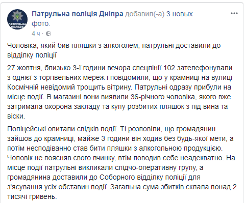 В одном из магазинов Днепра мужчина разбил алкоголя на витрине на сумму более 2 тысяч гривен. Об этом сообщает пресс-служба патрульной полиции Днепра в Facebook.