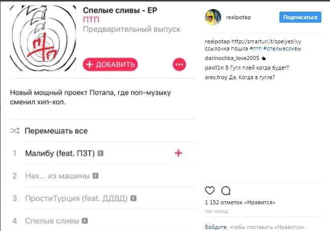 Артист теперь выступает под псевдонимом ПТП. На странице в Instagram Потап также сообщил, что уже выпустил дебютный миниальбом своего проекта под названием "Спелые сливы". Продюсер добавил, что мини-альбом "Спелые сливы" состоит из четырех треков.