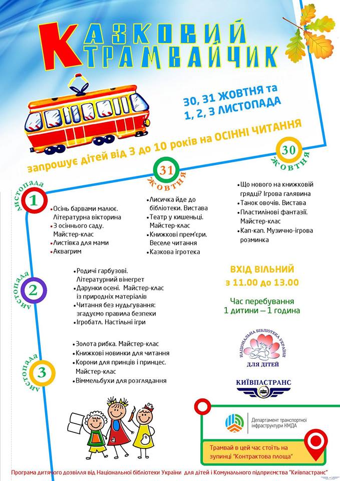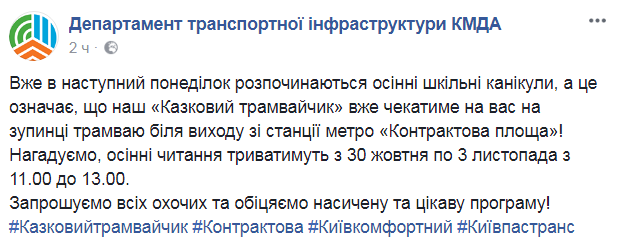 "Уже в следующий понедельник начинаются осенние школьные каникулы, а это значит, что наш "Сказочный трамвайчик" уже ждать вас на остановке трамвая у выхода из станции метро "Контрактовая площадь"! Напоминаем, осенние чтения пройдут с 30 октября по 3 ноября с 11.00 до 13.00", - говорится в сообщении.