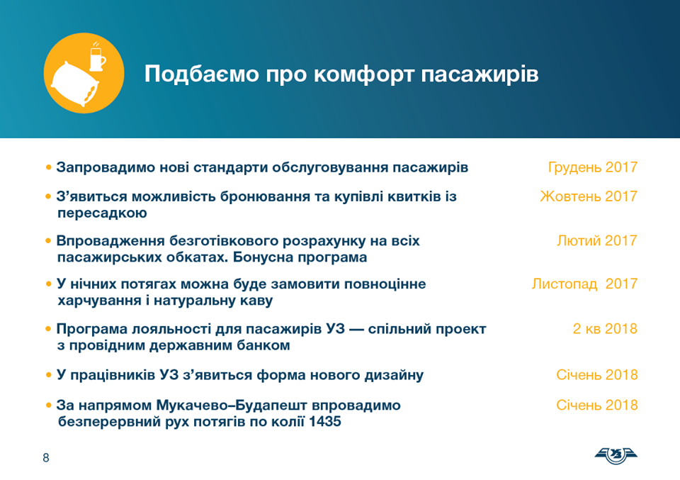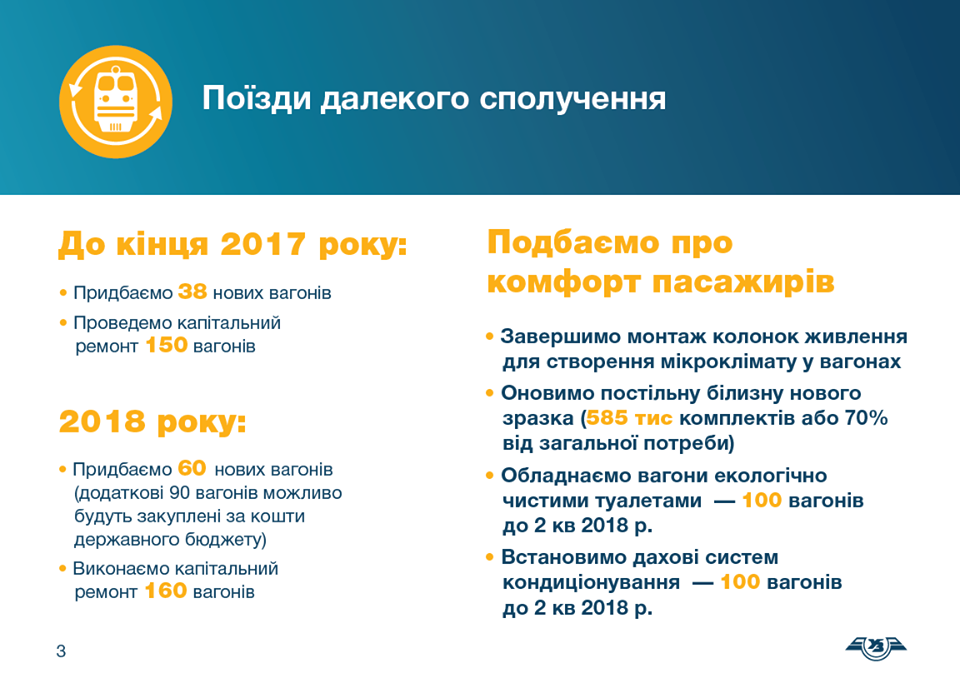 Об этом говорится в презентации ПАО "УЗ", опубликованной на официальной Facebook-странице премьер-министра Украины Владимира Гройсмана.