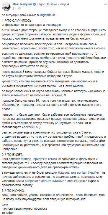Сегодня, 28 октября, около двух часов ночи в результате рейда Нацполиции во время вечеринки в Jugendhub в Киеве представители военкомата силой забрали 10 человек. О подробностях жесткой облавы и версиислучившегося со слов владельцев Jugendhub и очевидцев сообщил брат народного депутата от БПП Мустафы Найеса - Маси Найем на своей странице в Facebook.