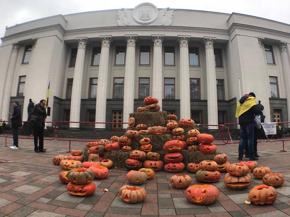 12:12 На МихоМайдане помнят, что сегодня - Хэллоуин. Перед Верховной Радой сложили гору тыкв.