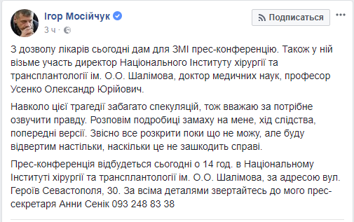 Также в ней примет участие директор Национального Института хирургии и трансплантологии им. А.А. Шалимова, доктор медицинских наук, профессор Усенко Александр Юрьевич. Вероятно, врачи расскажут про состояние Мосийчука и проведенную ему операцию.