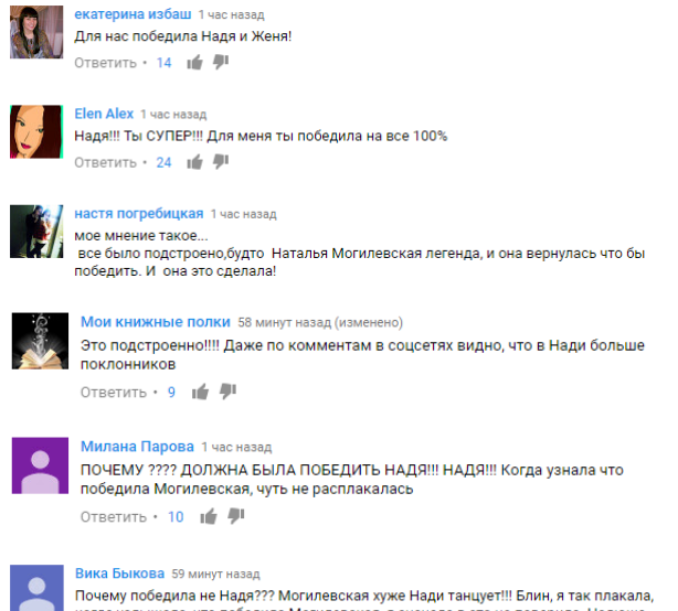 Их поклонники крайне раздраженно восприняли победу Натальи Могилевской. В комментариях на youtube-канале проекта они возмущались, что результат был подстроен, а победить должна была Дорофеева.