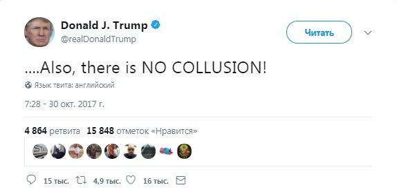 Американский президент позднее подчеркнул, что между его штабом и Россией "НЕ БЫЛО СГОВОРА".