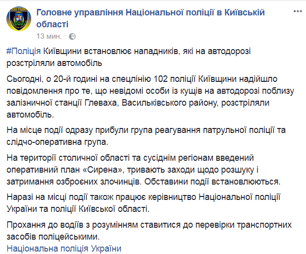 "На территории столичной области и соседним регионам введен оперативный план "Сирена", продолжаются мероприятия по розыску и задержанию вооруженных преступников… Просьба к водителям с пониманием относиться к проверке транспортных средств полицейскими", - говорится в сообщении, обнародованном на странице областного главка полиции в соцсети Фейсбук.