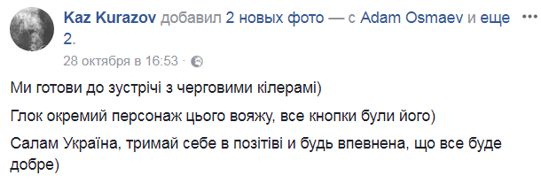 В субботу, 28 октября, за два дня до нападения на автомобиль Осмаевых, Каз Куразов опубликовал на персональной Facebook-странице заметку "о готовности встретится с киллерами". Текст он сопроводил фото с Адамом Осмаевым и Аминой Окуевой в автомобиле.