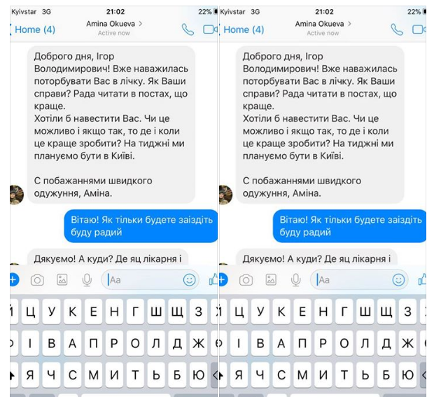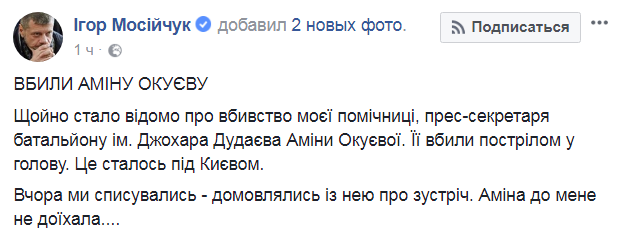 "Только что стало известно об убийстве моей помощницы, пресс-секретаря батальона им. Джохара Дудаева Амины Окуевой. Ее убили выстрелом в голову. Это произошло под Киевом. Вчера мы списывались - договаривались с ней о встрече. Амина ко мне не доехала", - написал нардеп.