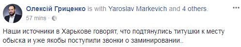 "Наши источники в Харькове говорят, что подтянулись титушки к месту обыска и уже якобы поступили звонки о заминировании", - добавил Гриценко.