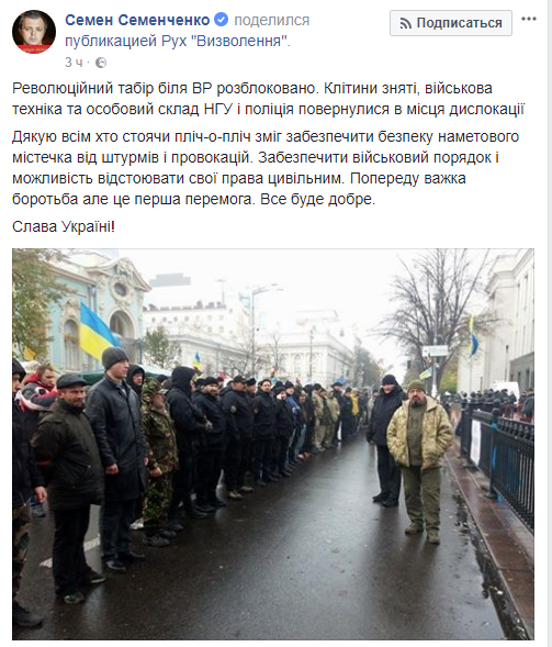"Революционный лагерь возле ВР разблокирован. Клетки сняты, военная техника и личный состав НГУ и полиции вернулись в места дислокации", – пишет нардеп.