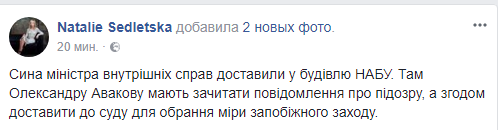 Сына министра внутренних дел Александра Авакова уже доставили в здание НАБУ, где ему должны сообщить о подозрении по коррупционному делу о закупках МВД рюкзаков. Об этом сообщает журналист Наталья Седлецкая в Facebook.