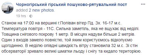 На горе Поп-Иван, где стоит обсерватория, толщина снежного покрова составляет один метр, местами ветром надуло более двух метров снега. Об этом сообщает пресс-служба Черногорского горного поисково-спасательного поста на странице в Facebook.
