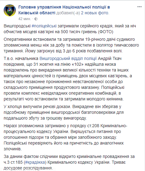 В Вышгороде 19-летний рецидивист ограбил две кофейни на полмиллиона