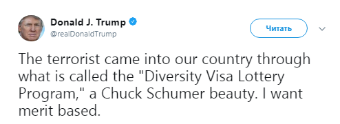 После вчерашнего теракта на Манхэттене в Нью-Йорке Дональд Трамп заявил, что США необходимо отменить раздачу видов на жительство в рамках Diversity Visa Lottery Program. Об этом президента США написал в Twitter.