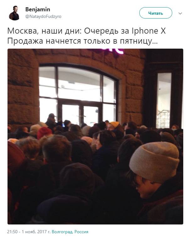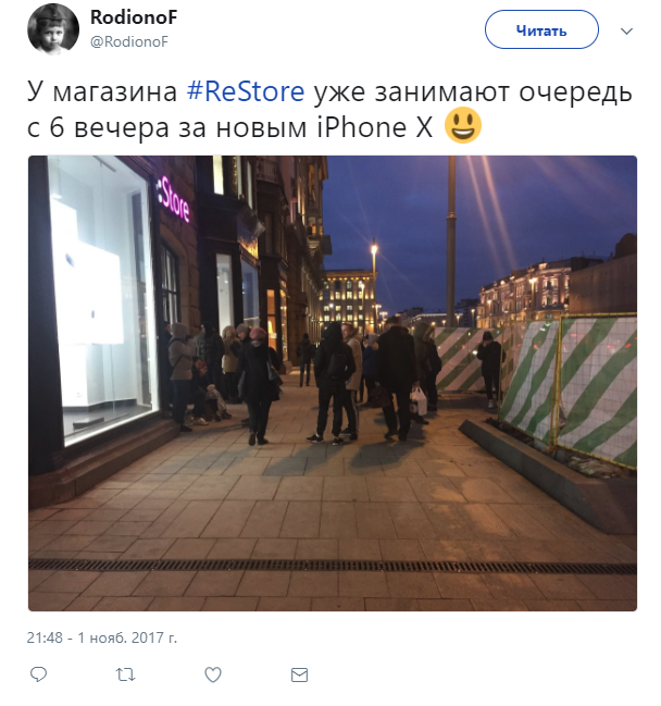 Очевидцы сообщают, что в очереди стоят примерно 50 человек. При этом за iPhone 8 очередей не было, что вполне объяснимо: iPhone X гораздо более привлекательный аппарат, какое-то время он будет в дефиците, и приобрести его без ожидания получится только у тех, кто займёт в очереди первые места.