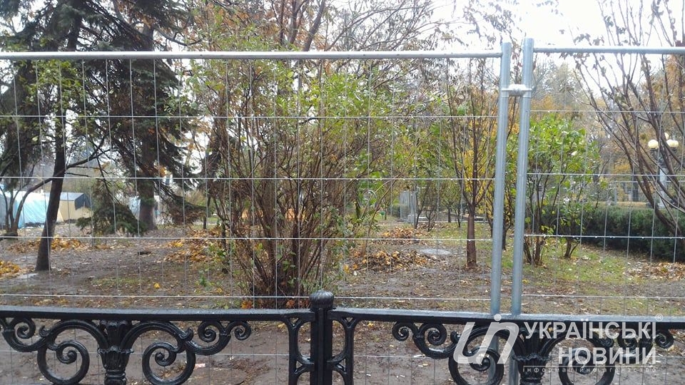 Входы в лагерь со стороны ул. Грушевского перекрыты самодельными деревянными баррикадами и металлическим забором, который ранее демонтировала полиция.