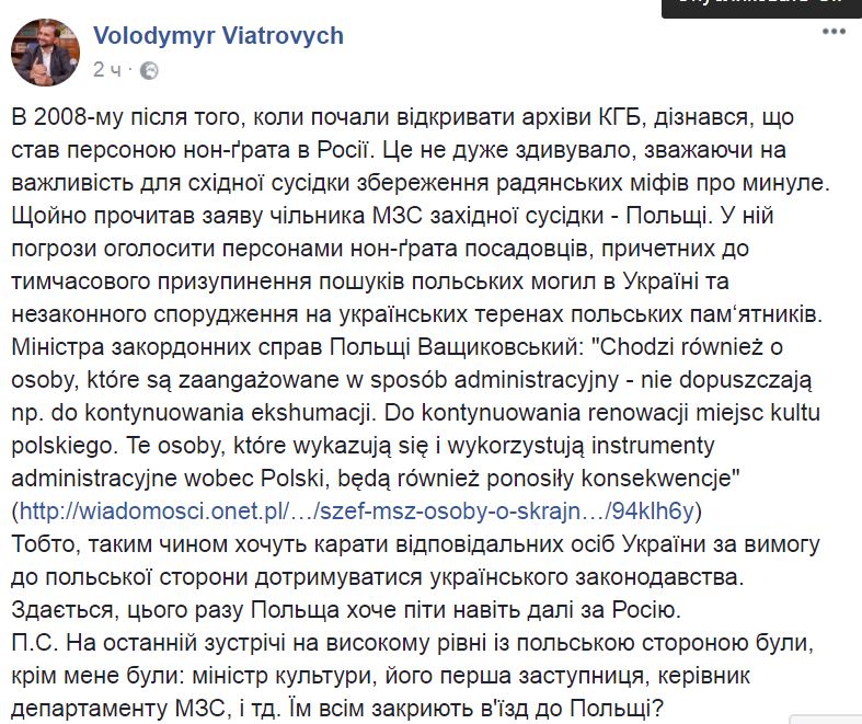 "Прочитал заявление главы МИД западной соседки - Польши. В ней угрозы объявить персонами нон-грата чиновников, причастных к временной приостановке поисков польских могил в Украине и незаконного строительства на украинской территории польских памятников. То есть, таким образом хотят наказывать ответственных лиц Украины за требование к польской стороне соблюдать украинское законодательство. Кажется, на этот раз Польша хочет пойти даже дальше Россию. П.С. На последней встрече на высоком уровне с польской стороной были, кроме меня были: министр культуры, его первая заместитель, руководитель департамента МИД, и тд. Им всем закроют въезд в Польшу?", - пишет Вятрович.