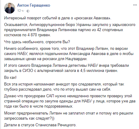 "Что здесь необычного, спросите Вы? Ничего особенного, кроме того, что этот Владимир Литвин, по версии самого НАБУ, являлся подельником Александра Авакова в деле о якобы завышенных ценах на рюкзаки для Нацгвардии. И этого самого Владимира Литвина детективы НАБУ вчера требовали закрыть в СИЗО с альтернативой залога в 4,5 миллиона гривен", - написал Геращенко.