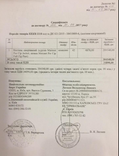 Он сообщил в Facebook, что НАБУ закупило у харьковского предпринимателя Владимира Литвинова партию из 42 спортивных костюмов по 4 870 гривен.