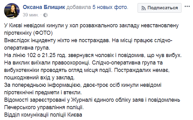 "Позвонил мужчина и сказал, что слышал взрыв. На место выехали взрывотехники. Они рассказали, что в результате взрыва поврежден вход в заведение, пострадавших нет", - сообщила изданию глава отдела коммуникации главного управления Нацполиции в Киеве Оксана Блищик.