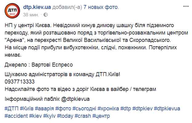 Также на Facebook-странице сообщества dtp.kiev.ua сообщается, что в центре Киева возле подземного перехода на перекрестке улиц Большой Васильковской и Павла Скоропадского неизвестный бросил дымовую шашку.