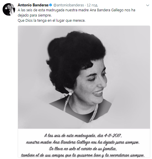 "В шесть часов утра наша мать Ана Бандера Гайего покинула нас навсегда", - написал Антонио Бандерас.