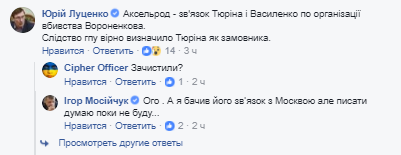В комментарии под постом нардепа Игоря Мосийчука о личности расстрелянного в Харькове коммерсанта, Луценко отметил, что "Аксельрод - связь Тюрина и Василенко по организации убийства Вороненкова. Следствие ГПУ верно определило Тюрина как заказчика".