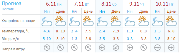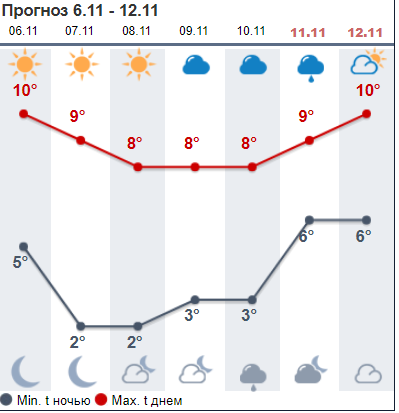 Сайт Sinoptik.ua считает, что без дождей все-таки не обойдется. Осадки вероятны в четверг и пятницу - 9 и 10 ноября. Дневная температура составит +6...+9.