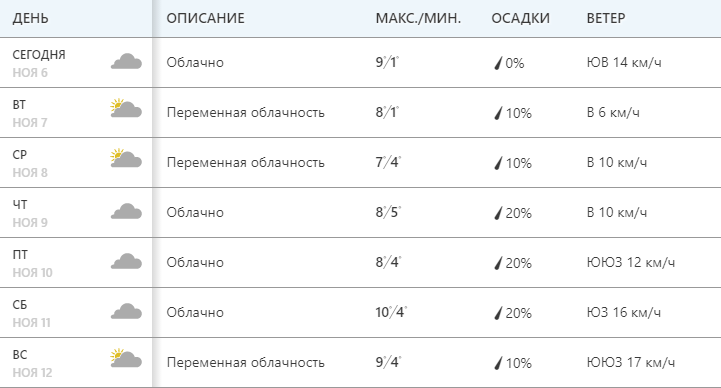 Сайт Weather.com обещает преимущественно облачную погоду всю неделю. При этом осадков не ожидается. Днем +7...+10.