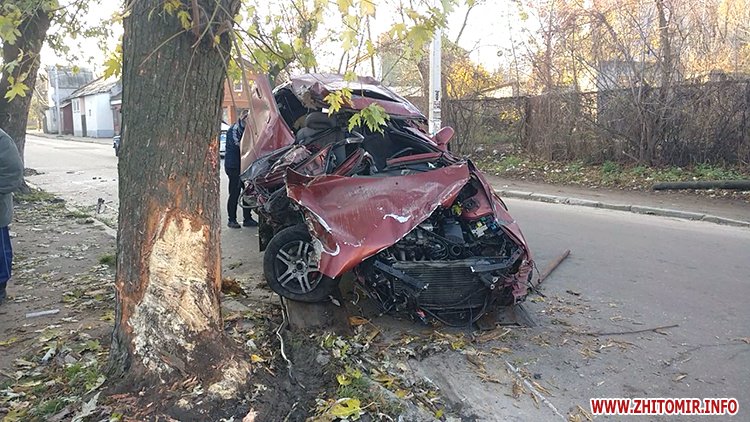 Авария произошла по ул. Старовильской, 24 около 3.54 утра. Автомобиль Mazda 626 ехал со стороны Богунского района и снес в дерево и врезался дом.