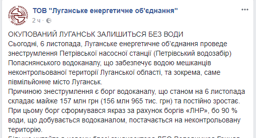 "При этом долг сформировался как раз за счет долгов так называемой "ЛНР", поскольку 90% воды, добываемой водоканалом, поставляется на неконтролируемую территорию", - объясняют в компании.