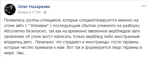 "Появились группы угонщиков, которые специализируются именно на угоне авто с "бляхами" с последующим сбытом угнанного на разборку. Абсолютно безопасно, так как на временно ввезенное верблюдом авто заявление об угоне могут написать только верблюд либо иностранный владелец авто... Печально, что страдают и иностранцы-гости Украины, которые честно приехали к нам. Вот так и формируется лицо Украины в мире", - написал он.