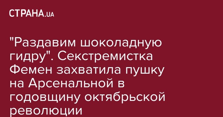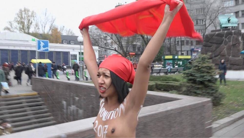 Сегодня, в честь столетия октябрьской революции 1917 года, секстремистка Фемен в красной косынке работницы и оригинальном галифе сотрудников КГБ СССР захватила пушку в районе завода "Арсенал". Об этом сообщает журналист "Страны".