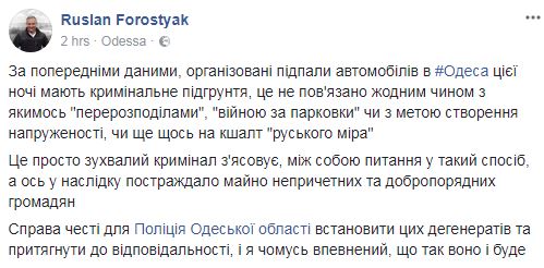 В полиции считают, что поджоги автомобилей, которые произошли этой ночью, имеют криминальную подоплеку. Об этом пишет на своей странице в Facebook советник начальника одесской полиции Руслан Форостяк.