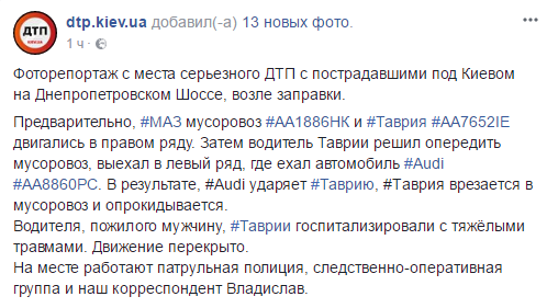 "Предварительно, МАЗ мусоровоз АА1886НК и Таврия АА7652IE двигались в правом ряду. Затем водитель Таврии решил опередить мусоровоз, выехал в левый ряд, где ехал автомобиль Audi AA8860PC. В результате, Audi ударяет Таврию, Таврия врезается в мусоровоз и опрокидывается", - говорится в сообщении.