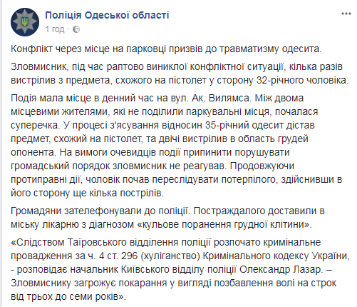"Происшествие имело место в дневное время на ул. Ак. Вильямса. Между двумя местными жителями, которые не поделили парковочное место, начался спор. В процессе выяснения отношений 35-летний одессит достал предмет, похожий на пистолет и дважды выстрелил в оппонента", - заявили в полиции.