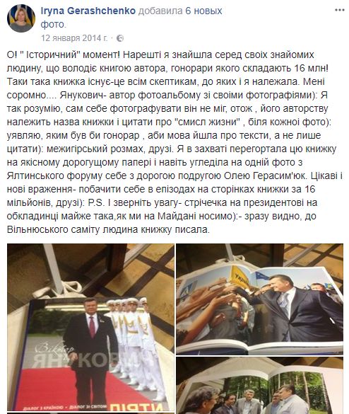 Кроме того, среди книг Януковича есть фотоальбом с его снимками. Об этом писала в своем Facebook народный депутат Ирина Геращенко. "Я так понимаю, сам себя фотографировать он не мог, поэтому его авторству принадлежит название книги и цитаты о "смысле жизни", возле каждого фото", - заявила Геращенко.