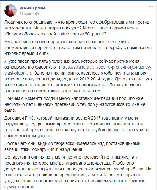 "Донецкая ГФС, которой приказали весной 2017 года найти у меня нарушения, под разными предлогами не торопилась выполнять этот незаконный приказ, пока ее к концу лета в грубой форме не нагнули на самом высоком уровне. После чего они, видимо творчески издеваясь над постановщиками задачи, таки "обнаружили" нарушения", - рассказывает Гужва.