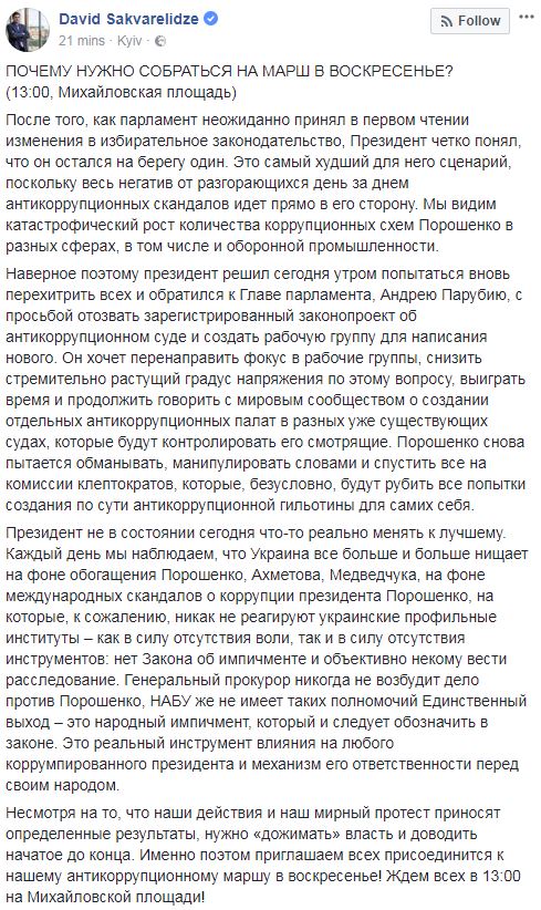Президент не в состоянии сегодня что-то реально менять к лучшему. Каждый день мы наблюдаем, что Украина все больше и больше нищает на фоне обогащения Порошенко, Ахметова, Медведчука, на фоне международных скандалов о коррупции президента Порошенко, на которые, к сожалению, никак не реагируют украинские профильные институты – как в силу отсутствия воли, так и в силу отсутствия инструментов: нет Закона об импичменте и объективно некому вести расследование. Генеральный прокурор никогда не возбудит дело против Порошенко, НАБУ же не имеет таких полномочий. Единственный выход – это народный импичмент, который и следует обозначить в законе. Это реальный инструмент влияния на любого коррумпированного президента и механизм его ответственности перед своим народом", - пишет Сакварелидзе.