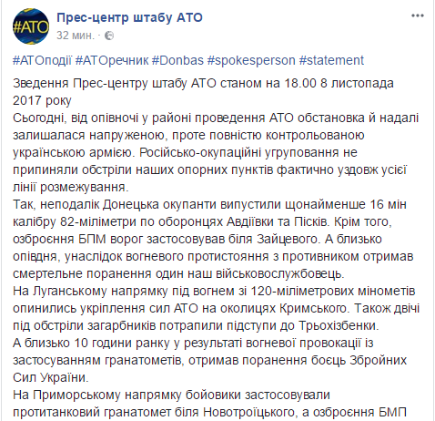 "Около полудня в результате огневого противостояния с противником получил смертельное ранение один наш военнослужащий", - сказано в сообщении.