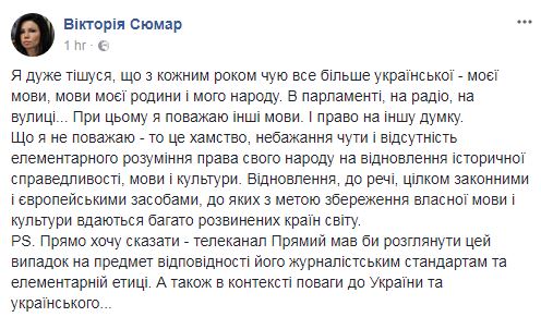 "Телеканал "Прямой" должен рассмотреть этот случай на предмет соответствия его журналистским стандартам и элементарной этике. А также в контексте уважения к Украине и всему украинскому", - написала Сюмар в Facebook.