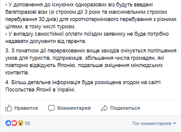 "По случаю визита государственного министра иностранных дел Японии Кадзуюки Накане в Киев 9 ноября этого года для переговоров с его партнерами в правительстве Украины и для участия в событиях в рамках года Японии в Украине, были определены меры по упрощению визовых требований для краткосрочного пребывания для граждан Украины (владельцев обычных загранпаспортов), которые вступят в силу с 1 января 2018 года", - говорится в опубликованном сообщении.