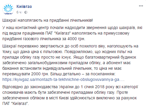 Аферисты выдают себя за работников "Киевгаза" и настаивают на принудительном приобретении газового счетчика за 4000 грн. Главным образом мошенники обращаются к старикам и говорят, что такая цена за счетчик является льготной.