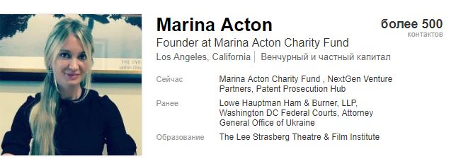 Марине Актон 34 года, она родилась 5 декабря 1983 года. В Украине Марина училась в Национальном университете государственной налоговой службы в Ирпене. В 2005-2010 годах она работала помощницей бывшего генерального прокурора Святослава Пискуна, правда, еще под девичьей фамилией.