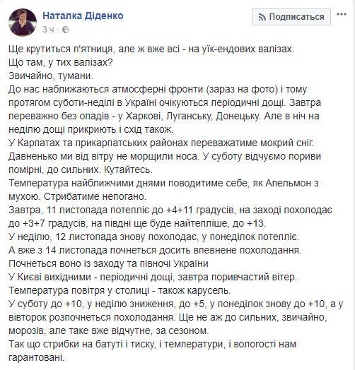 По словам Диденко, 11 ноября потеплеет до +4...+11 градусов, на западе похолодает до +3...+7 градусов, на юге будет теплее - до +13.