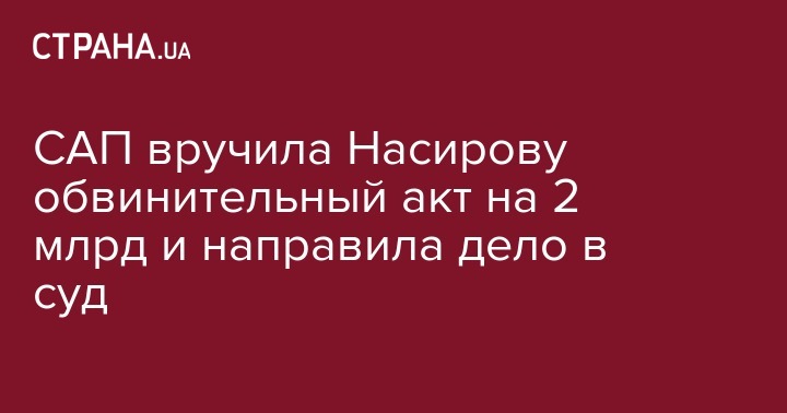 Специализированная антикоррупционная прокуратура (САП) вручила отстраненному от должности председателя Государственной фискальной службы Роману Насирову обвинительный акт по его делу о нанесении убытков государству в размере 2 млрд гривен. Об этом сообщила САП в Facebook.